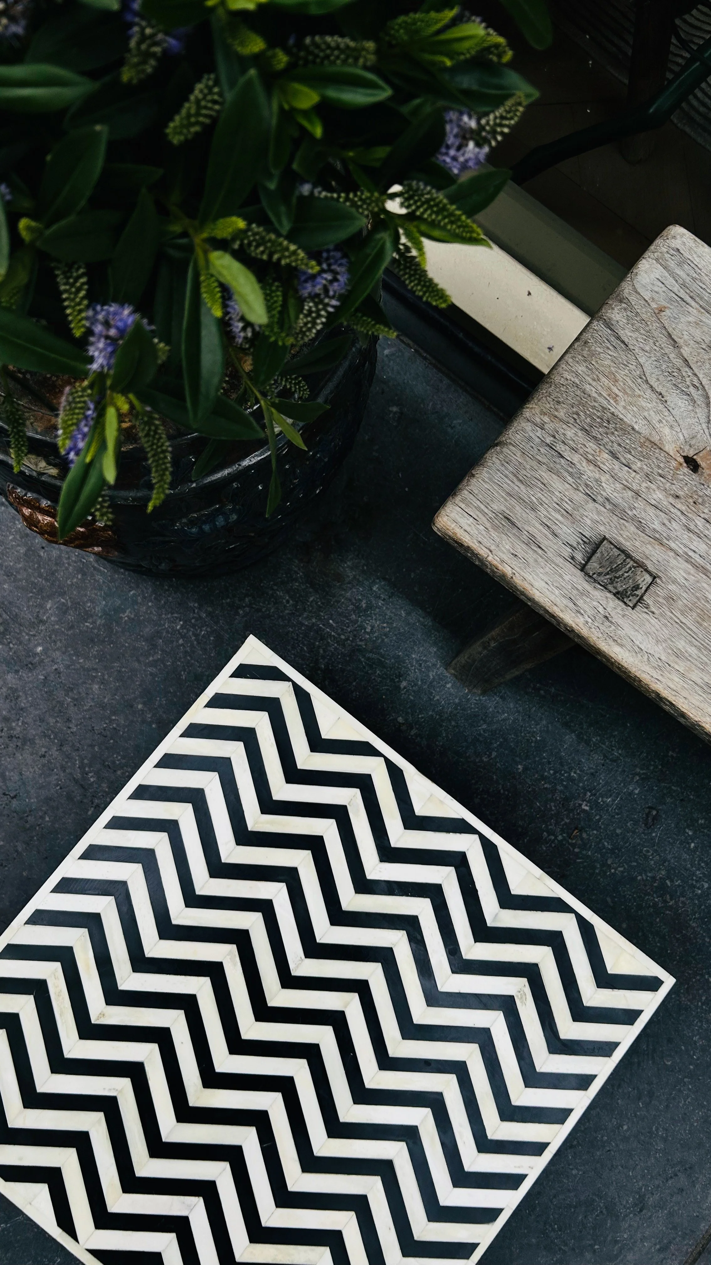 Black and white chevron pattern creates a play of light and movement, making these tables more than functional furniture – they’re graphic artworks for your interior.