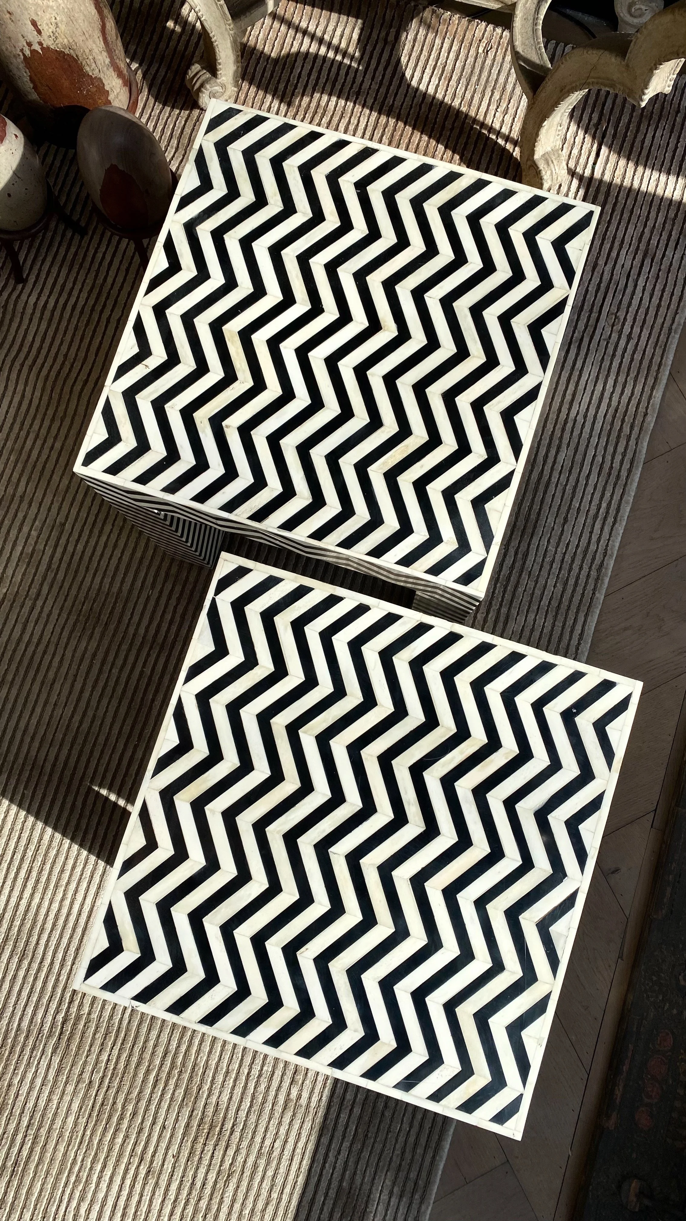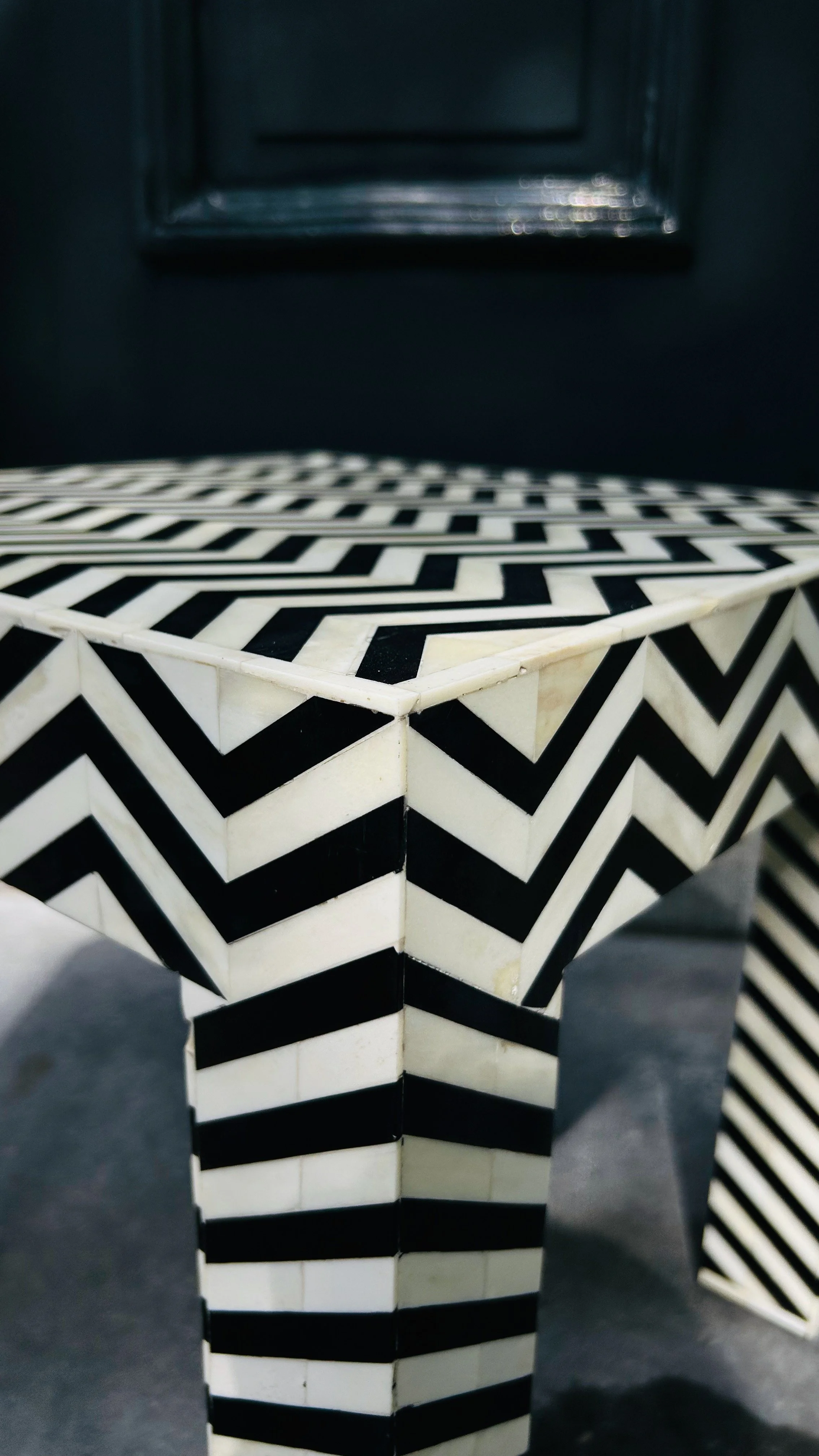 Make a statement with bold black-and-white chevron pattern side tables. Each piece has been handmade in India, where artisans carefully inlay polished horn into a timeless and contemporary geometric design.